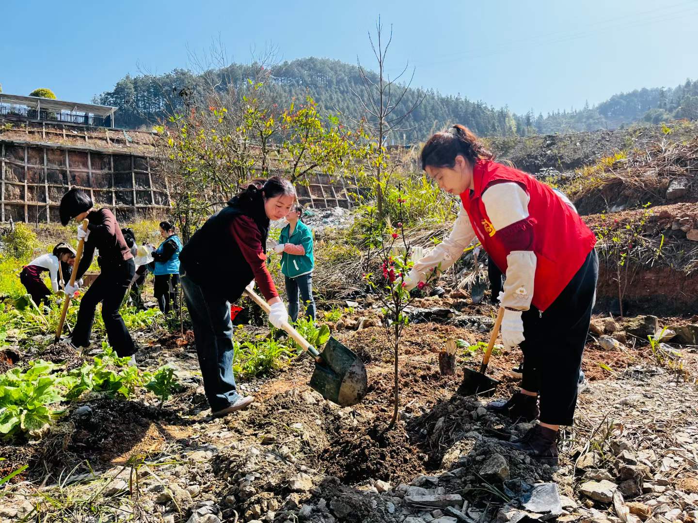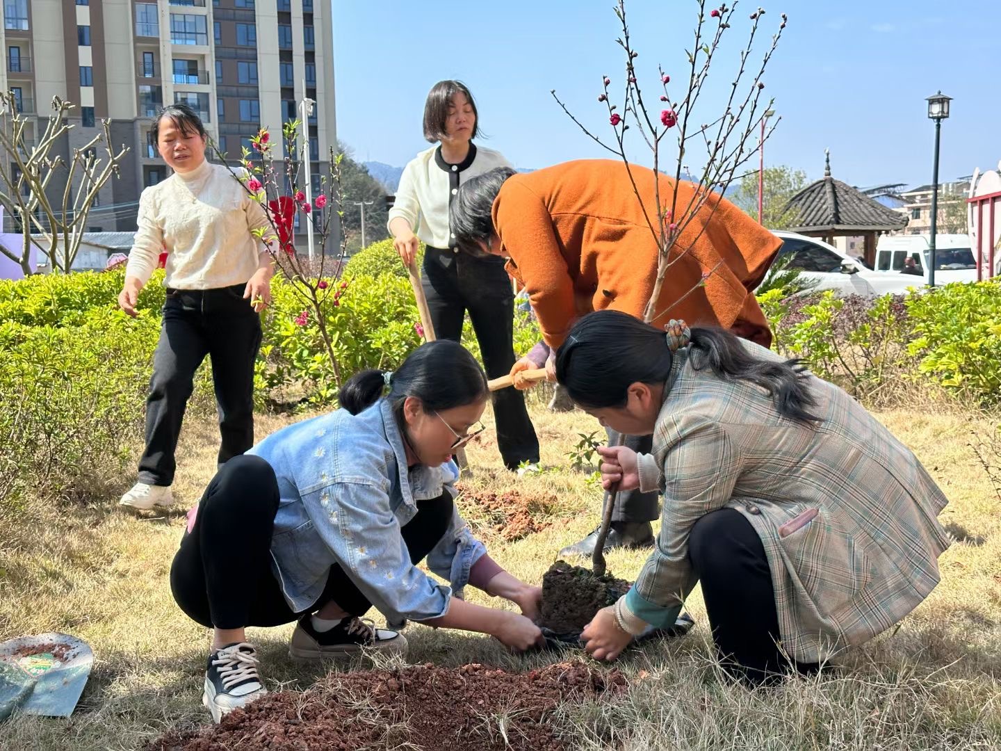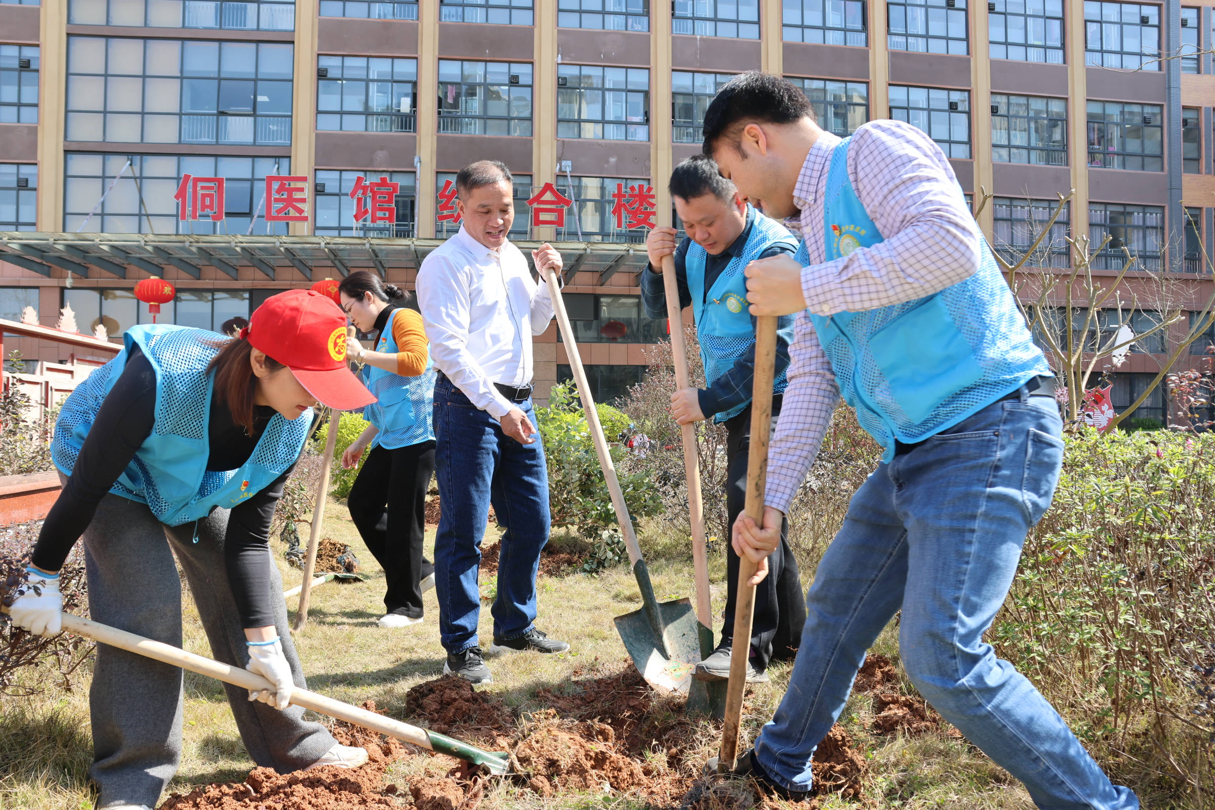 植树现场,在春日暖阳中,大家规划好种植区域,大家三人一组,五人一群,分工协作,充分发挥“不怕苦、不怕脏、不怕累”的精神,齐心协力,铲除杂草,挥锄挖窝,回填熟土,扶正药苗,培土浇水,一气呵成。经过一番辛勤劳作,原本杂乱的草地上种植上了三十多类四百余株中草药,诸如桃花、金花茶、麦冬、八角金盘、桃草珊瑚、桃金娘等,一颗颗树苗整齐排列、迎风而立,在春风中展现出勃勃生机,为中医医院增添了一抹新绿。